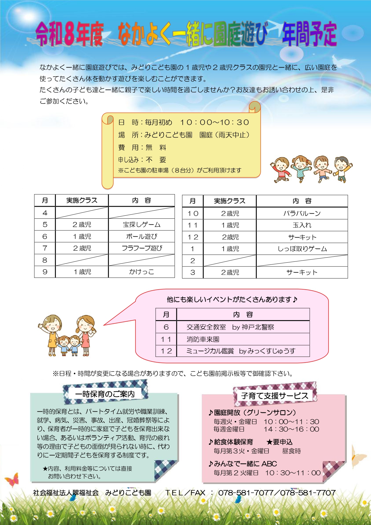 なかよく一緒に園庭遊び 令和8年度 なかよく一緒に園庭遊び年間予定の御案内 2026年03月25日 『令和8年度 なかよく一緒に園庭遊び年間予定』の御案内です。 みどりこども園の子ども達と一緒に、広い園庭で様々な運動遊具を使った遊びや集団遊びができます。 R8年度 なかよく一緒に園庭遊び 予定表 カテゴリーを選択 未分類 (1) お知らせ (32) グリーンサロン (114) なかよく一緒に園庭遊び (30) みんなで一緒にABC (60) 先生と一緒に親子であそぼう (19) 選択してください 2026 (9) 2025 (37) 2024 (37) 2023 (33) 2022 (33) 2021 (21) 2020 (16) 2019 (16) 2018 (9) 2017 (17) 2016 (10) 2014 (4) 2013 (2)