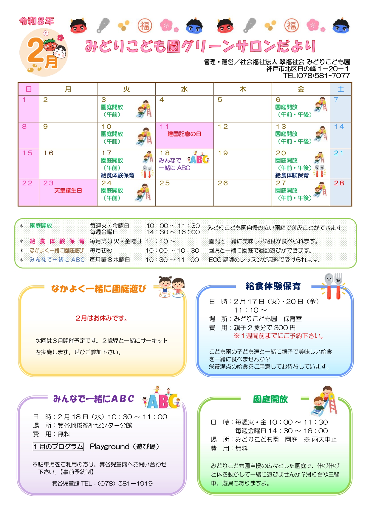 グリーンサロン 令和7年度 2月みどりこども園グリーンサロンだより 2026年01月26日 「令和7年度 2月みどりこども園グリーンサロンだより」を掲載しました。 R7年度 2月グリーンサロンだより カテゴリーを選択 未分類 (1) お知らせ (31) グリーンサロン (112) なかよく一緒に園庭遊び (28) みんなで一緒にABC (58) 先生と一緒に親子であそぼう (19) 選択してください 2026 (2) 2025 (37) 2024 (37) 2023 (33) 2022 (33) 2021 (21) 2020 (16) 2019 (16) 2018 (9) 2017 (17) 2016 (10) 2014 (4) 2013 (2)