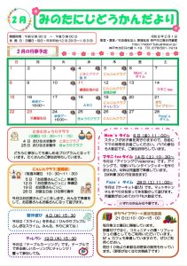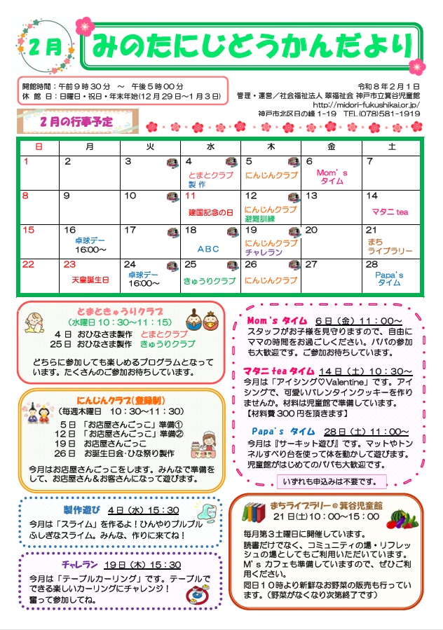 箕谷児童館だより 令和7年度 2月児童館だより 2026年02月02日 令和7年度「2月児童館だより」を掲載しました。 PDFダウンロード児童館だよりR8.2月号 カテゴリーを選択 お知らせ (58) 箕谷児童館だより (145) グリーンサロン (64) まちライブラリー (6) 選択してください 2026 (2) 2025 (40) 2024 (37) 2023 (25) 2022 (26) 2021 (21) 2020 (13) 2019 (13) 2018 (15) 2017 (14) 2016 (18) 2015 (23) 2014 (21) 2013 (5)
