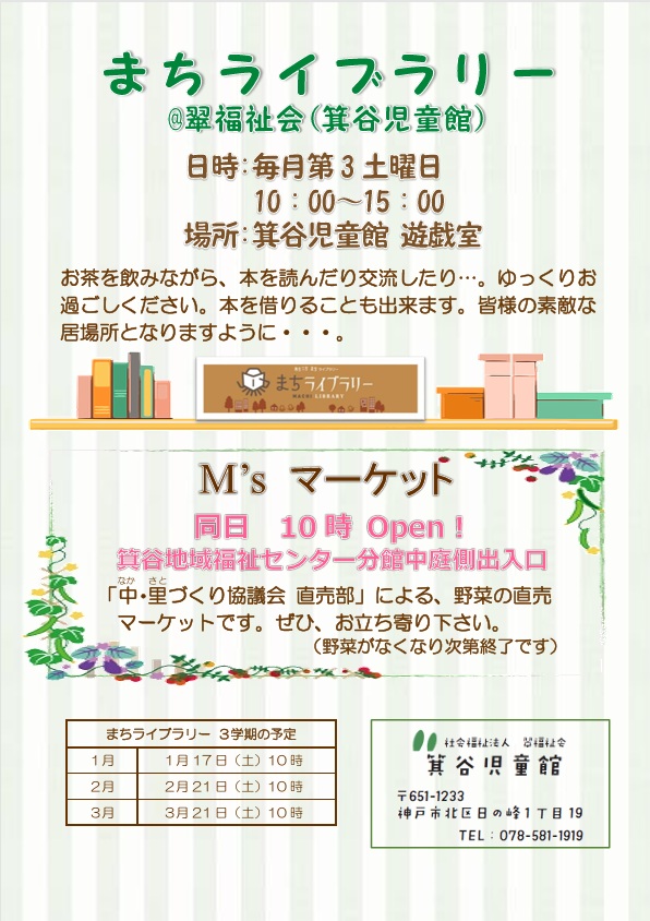 まちライブラリー 令和7年度3学期 まちライブラリーのお知らせ 2025年12月27日 令和7年度3学期 まちライブラリーのお知らせを掲載しました。 PDFダウンロードポスター3学期【まちライブラリー】 カテゴリーを選択 お知らせ (58) 箕谷児童館だより (144) グリーンサロン (63) まちライブラリー (6) 選択してください 2025 (40) 2024 (37) 2023 (25) 2022 (26) 2021 (21) 2020 (13) 2019 (13) 2018 (15) 2017 (14) 2016 (18) 2015 (23) 2014 (21) 2013 (5)