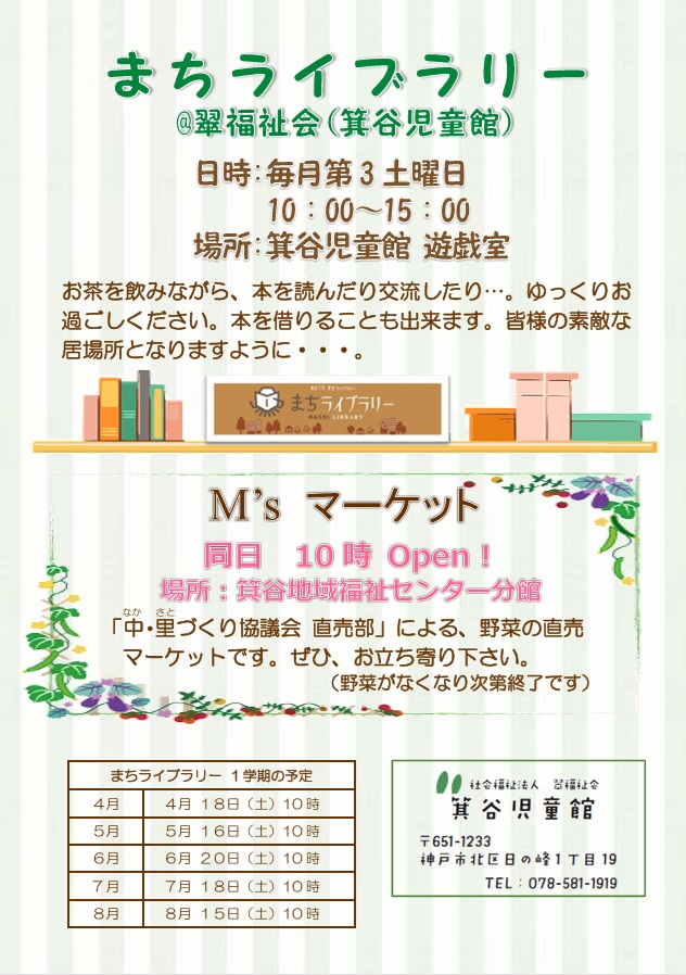 まちライブラリー 令和8年度1学期 まちライブラリーのお知らせ 2026年04月08日 令和8年度1学期 まちライブラリーのお知らせを掲載しました。 PDFダウンロードポスター1学期【まちライブラリー】R8 カテゴリーを選択 お知らせ (61) 箕谷児童館だより (147) グリーンサロン (66) まちライブラリー (7) 選択してください 2026 (10) 2025 (40) 2024 (37) 2023 (25) 2022 (26) 2021 (21) 2020 (13) 2019 (13) 2018 (15) 2017 (14) 2016 (18) 2015 (23) 2014 (21) 2013 (5)