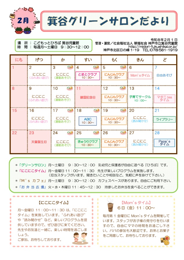 グリーンサロン 令和7年度 2月グリーンサロンだより 2026年02月02日 令和7年度「2月グリーンサロンだより」を掲載しました。 PDFダウンロードグリーンサロンだよりR8.2月号 カテゴリーを選択 お知らせ (58) 箕谷児童館だより (145) グリーンサロン (64) まちライブラリー (6) 選択してください 2026 (2) 2025 (40) 2024 (37) 2023 (25) 2022 (26) 2021 (21) 2020 (13) 2019 (13) 2018 (15) 2017 (14) 2016 (18) 2015 (23) 2014 (21) 2013 (5)