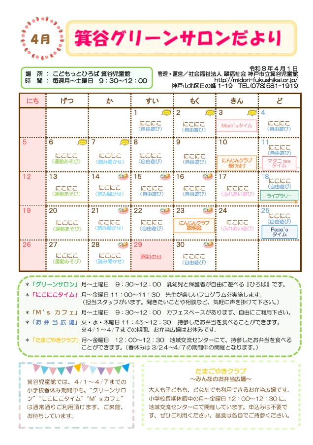 グリーンサロン 令和8年度 4月グリーンサロンだより 2026年04月03日 令和8年度「4月グリーンサロンだより」を掲載しました。 PDFダウンロードグリーンサロンだより4月号 カテゴリーを選択 お知らせ (58) 箕谷児童館だより (147) グリーンサロン (66) まちライブラリー (6) 選択してください 2026 (6) 2025 (40) 2024 (37) 2023 (25) 2022 (26) 2021 (21) 2020 (13) 2019 (13) 2018 (15) 2017 (14) 2016 (18) 2015 (23) 2014 (21) 2013 (5)