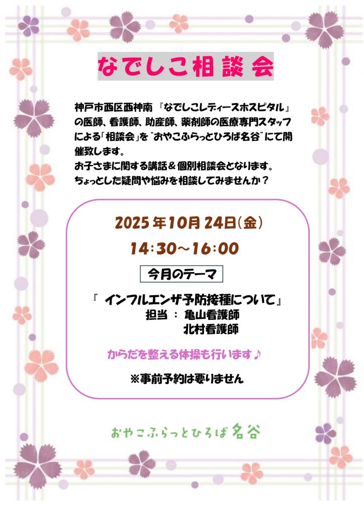 なでしこ相談会 開催日: 2025年10月24日 神戸市西区西神南 『なでしこレディースホスピタル』 の医師、看護師、助産師、薬剤師の医療専門スタッフ による「相談会」を“おやこふらっとひろば名谷”にて開 催致します。 お子さまに関する講話&個別相談会となります。 なでしこポスター2025.10月