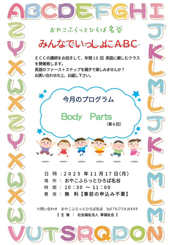 【第6回】みんなで一緒にABC 開催日: 2025年11月17日 ECCの講師をお招きして、年間10回英語に親しむクラスを開催致します。 レッスンでは、手遊びや絵本、絵カードを使いながら、小さなお子様でも楽しめる英語のファーストステップを、親子で楽しみます。 お誘い合わせの上、ぜひお越し下さい。 ABC ポスター2025年11月