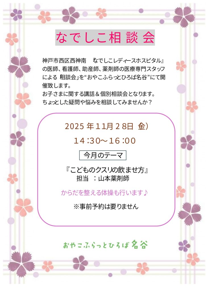 なでしこ相談会 開催日: 2025年11月28日 神戸市西区西神南 『なでしこレディースホスピタル』 の医師、看護師、助産師、薬剤師の医療専門スタッフ による「相談会」を“おやこふらっとひろば名谷”にて開 催致します。 お子さまに関する講話&個別相談会となります。 なでしこポスター2025.11月