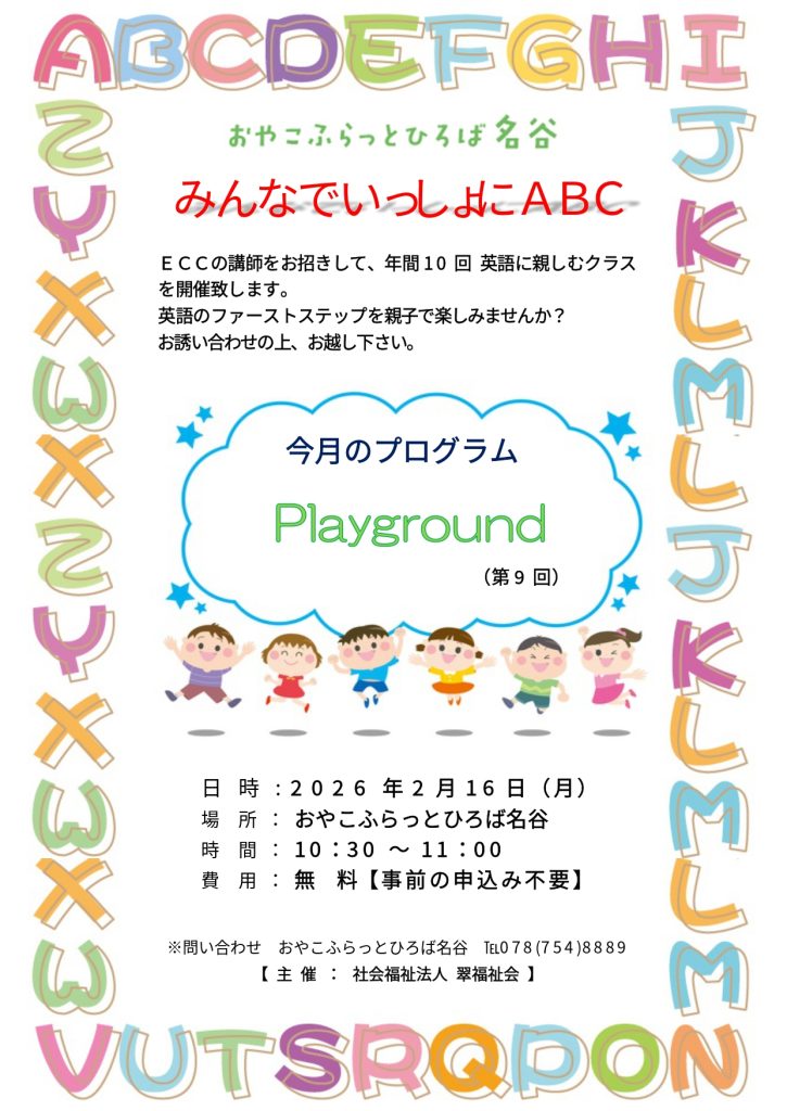 【第9回】みんなで一緒にABC 開催日: 2026年02月16日 ECCの講師をお招きして、年間10回英語に親しむクラスを開催致します。 レッスンでは、手遊びや絵本、絵カードを使いながら、小さなお子様でも楽しめる英語のファーストステップを、親子で楽しみます。 お誘い合わせの上、ぜひお越し下さい。 ABC 2026.2月ポスター