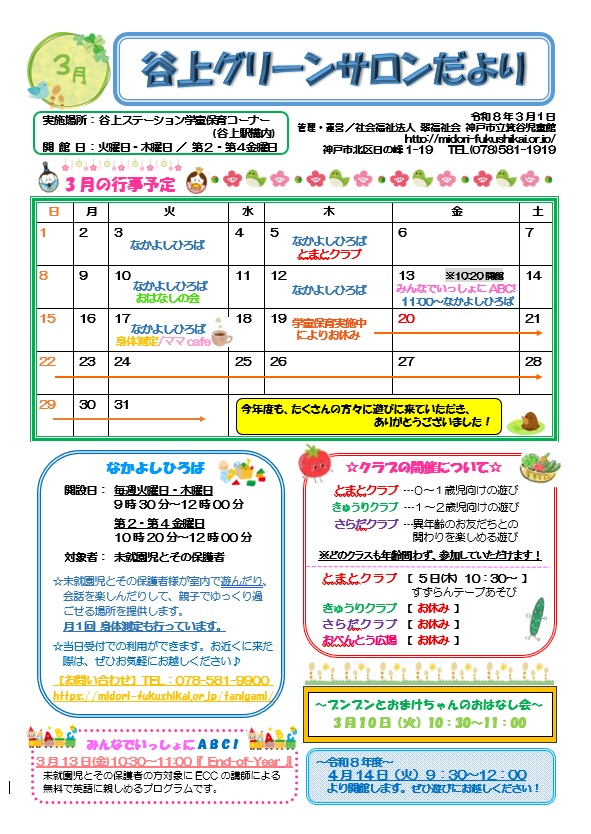 未分類 令和7年度「谷上グリーンサロンだより R8年3月号」 2026年02月28日 令和7年度「谷上グリーンサロンだより R8年3月号」を掲載しました。 谷上グリーンサロンだよりR8年3月号 カテゴリーを選択 未分類 (1) お知らせ (17) グリーンサロン (22) 選択してください 2026 (2) 2025 (15) 2024 (9) 2014 (2)