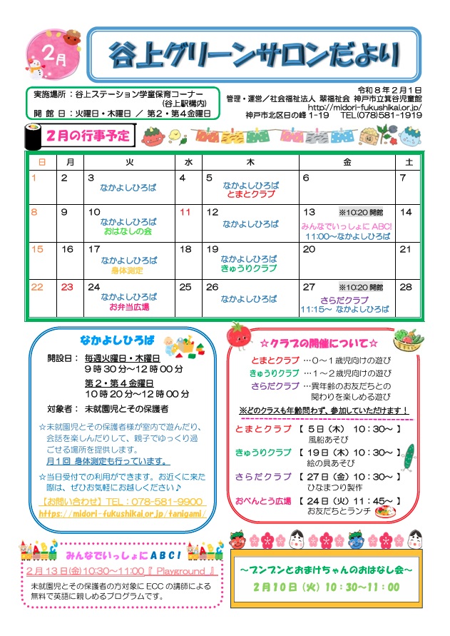 お知らせ グリーンサロン 令和7年度「谷上グリーンサロンだより R8年2月号」 2026年01月30日 令和7年度「谷上グリーンサロンだより R8年2月号」を掲載しました。 谷上グリーンサロンだよりR8年2月号 カテゴリーを選択 お知らせ (17) グリーンサロン (22) 選択してください 2026 (1) 2025 (15) 2024 (9) 2014 (2)